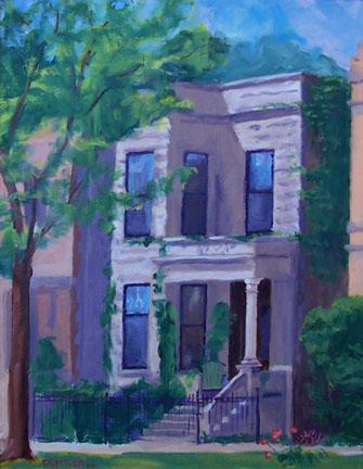 This is a commission I did for a friend whose daughter lives in Chicago near Wrigley Field. I took pictures of the house on the first nice day last April, before everything had grown out. I would have done an oil sketch on the spot, but this was a surprise Christmas gift and I heard dogs barking in the yard and concluded the owner was home and might see me. I took more pictures in the summer for better light, but by then the house was completely overgrown with the famous ivy that covers the outfield walls of Wrigley Field, so the April pictures came in handy for the details of the house. I moved the tree on the left closer to the house so that it would better obscure the house next door. I based the whole picture on the pillar in front of the door, and now I see the tree echoes the pillar. The picture was fun to do because of the classical lines of the house.