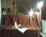 Here’s a painting I’m working on in still life class. I’ve worked on it for three sessions now. First I put in just the shadows, then added some color to the peach and added the background, and yesterday I added the highlight side of the vase and the darker part of the shadow running down the middle of the vase. I put some red in the shadow of the peach, but it still looks too orange–maybe it’s only the phone camera. Next week, the grapes! Here’s a photo of the set-up:
