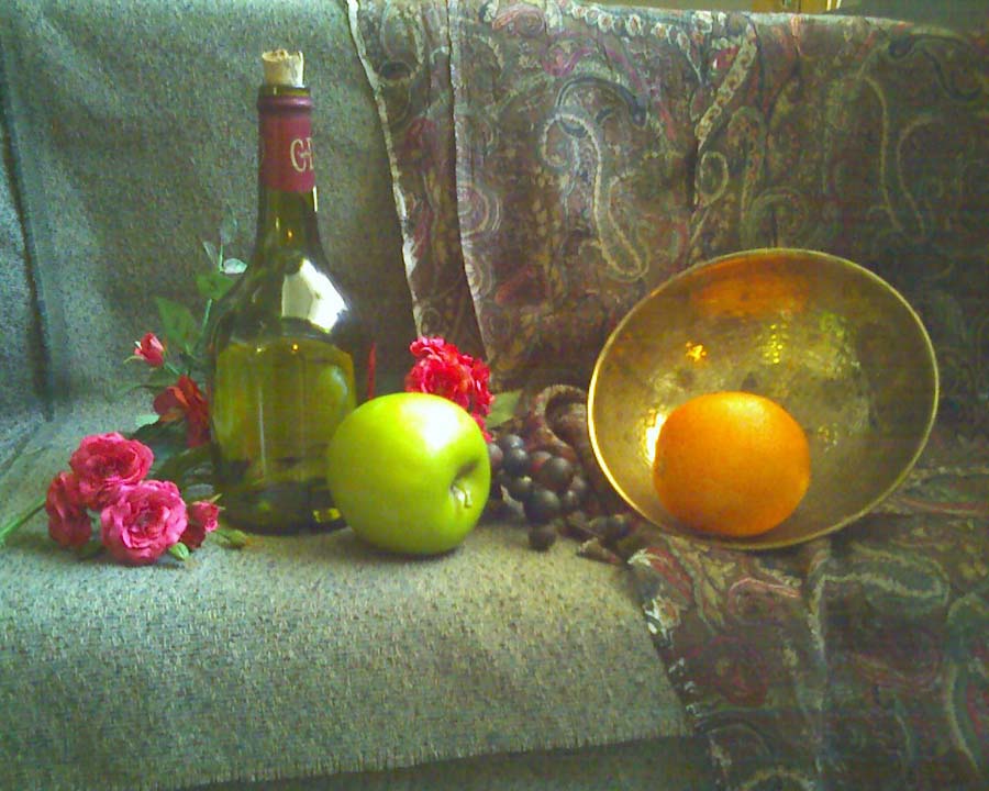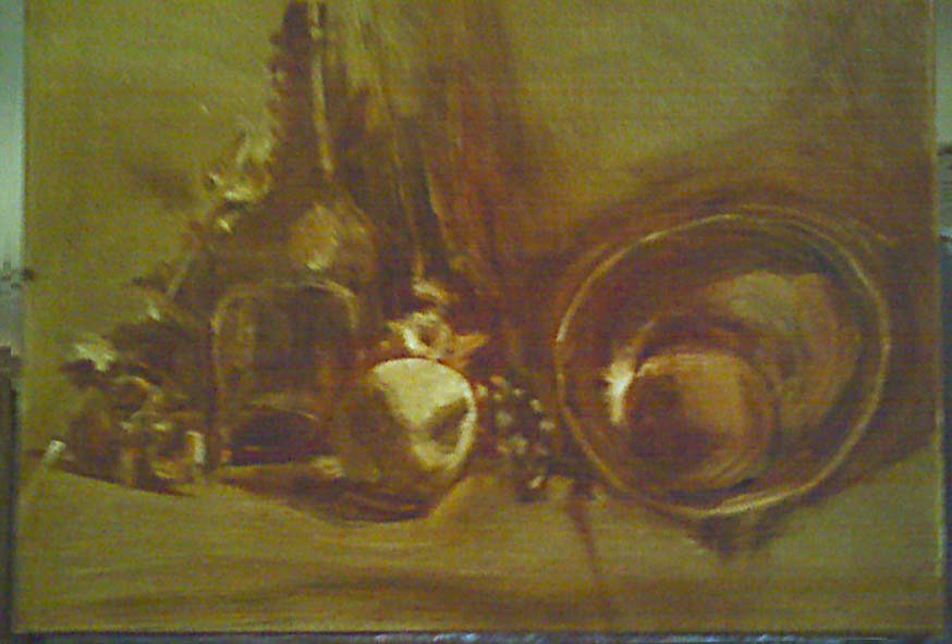 Last Tuesday I started a new still life. Having no ideas, and since Michael had offered to provide set-up items, I took him up on his offer. Here’s the result. Just a little more complicated than I would have had the courage for, but I’m glad he has that much confidence in me. I had a great time getting started with the underpainting of shadows and highlights. We’re now painting under natural light as we have enough daylight now between 3 and 6 pm. Here are photos of the set-up, one taken at 3 and one at 6 that show how much the light changes even though it’s indirect north light (taken with a camera phone). And finally, here’s a photo of my start on the painting, bigger this time, 16 x 20 inches; once again on double-oil-primed Belgian canvas, which I love painting on–like painting on air.