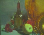I had a great class last night. As often happens, last week was terrible–I painted the background on the left of the picture a color that was too close to the color used in the bottle and therefore too warm, making the background not recede enough. Then I painted it over with a cooler color, but it was a blue I can only describe as “icky.” So I had a feeling things would go better this week, and they did. I had a great time painting the bottle and while doing that, I came up with (or rather my teacher Michael helped me come up with) a better color for the background. Also while focusing on the bottle, I managed to get started on putting in the flowers and greenery surrounding the bottle. Here’s a close up of the bottle and a picture of my palette at the end of class.