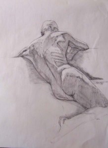 Two new life drawings from Bob Schultz’s class on Thursdays. I’m really working on shadows–trying to find the core of the shadow and put reflected light back into the shadows. Each drawing is done with charcoal pencils on 18×24-inch newsprint and took about 2 1/2 hours.