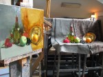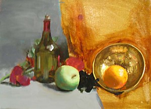 Yesterday, I painted the orange, brass bowl, added green to the apple shadow and massed in the grapes in very dark blue. The big yellow section behind the bowl will have to get some work soon, although I’m not sure how to do a complicated drape pattern. I also got a new camera, so hopefully the photos will be better. Below is the painting in front of the set-up.