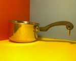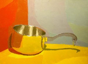 The latest color study. Instead of the primary colors the book called for, I picked my own more muted colors for a more harmonious look. Although that doesn’t show up very well in the photo, which I had to take with my cell phone because my new camera broke and was in for repair. The metal reflection inside the pan was the biggest challenge until I finally realized I needed maximum contrast between the highlight and shadow areas. The easiest part was the ring on the end of the handle–a few dabs of white and voila!