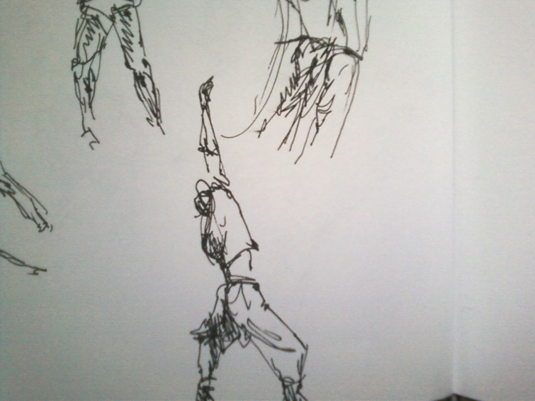 I started sketcking from an Alvin Ailey DVD this morning. My usual routine is to read a section of Walt Stanchfield over breakfast, then sketch for an hour. It’s been silent comedies (Harold Lloyd, Buster Keaton–lot’s of action) for the last few months, so I thought I try some dance. Inspring; great muscle definition.