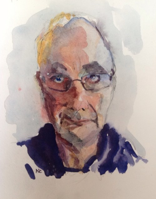 Small 5 x 7 inch two-hour watercolor. First hour I drew from an Ipad photo in pencil. For some reason, it was very difficult to get the looking-up part of the expression. Second hour, I erased most of the pencil and put down a thin all-over wash mostly concerned with color temperature. Then more layers for darks and detail. This is how I like to paint–just throw it on and hope something works.