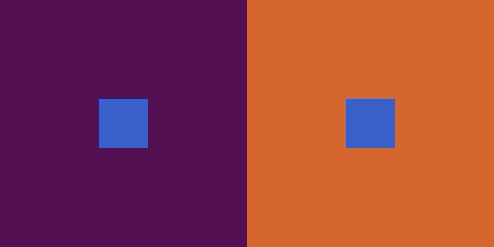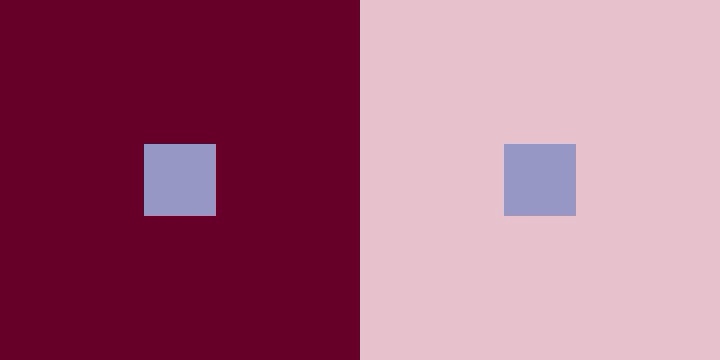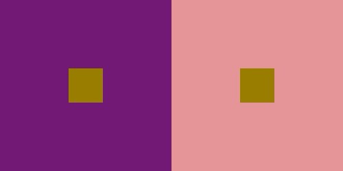 The first part of the exercise requires making one color look like two by varying the value, or brightness. So the two small squares in the examples above are both the same color, but the surrounding color makes one square look lighter or darker than the other.
