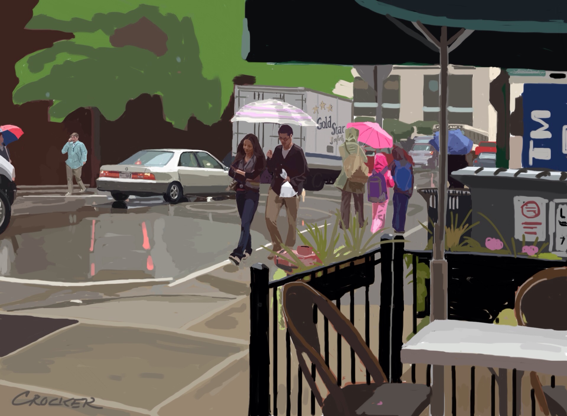 To complete my spring-weather theme, here's Chicago in the rain (specifically Starbucks on State just north of Chicago Ave.). Actually I started the picture last fall sitting at the window counter, and then finished it from photographs. The beauty of rain is the great reflections. This picture is also part of a series I started of people on their phones.