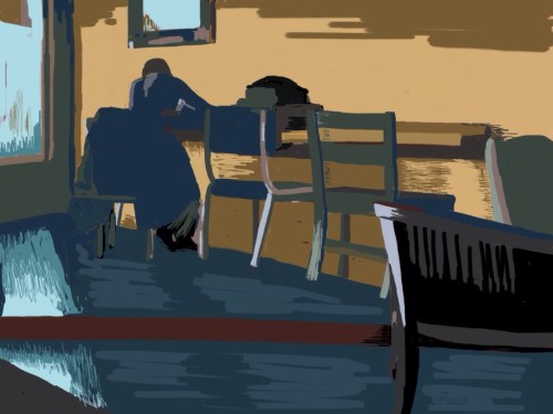 Ipad at Mother Fool’s An Ipad drawing I started at Mother Fool's coffee shop, then took a picture with my phone to use to finish the drawing. Here's the photo: I'm working on shapes, color, and, on the Ipad, mark-making. Share this: Click to share on Facebook (Opens in new window) Facebook Click to share on X (Opens in new window) X Like Loading... Related By kencrocker Fine artist; graphic artist; draughtsman; digital artist View all of kencrocker's posts.