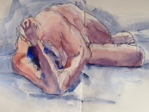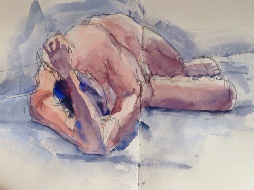 This is a half-hour traditional-media pencil and gouache sketch in my 5 x 8 Moleskin, with a little digital finish thrown in. In the original, the model's left arm didn't read right. So for the first time ever, I took a picture of the painting with my iPad camera, imported the image into the Procreate app I use for drawing, and touched up the arm. Okay, the arm's still a little too big (now that we're dissecting), but it does read better now as a complete arm, imho. Here's the original, so you can see if you agree.