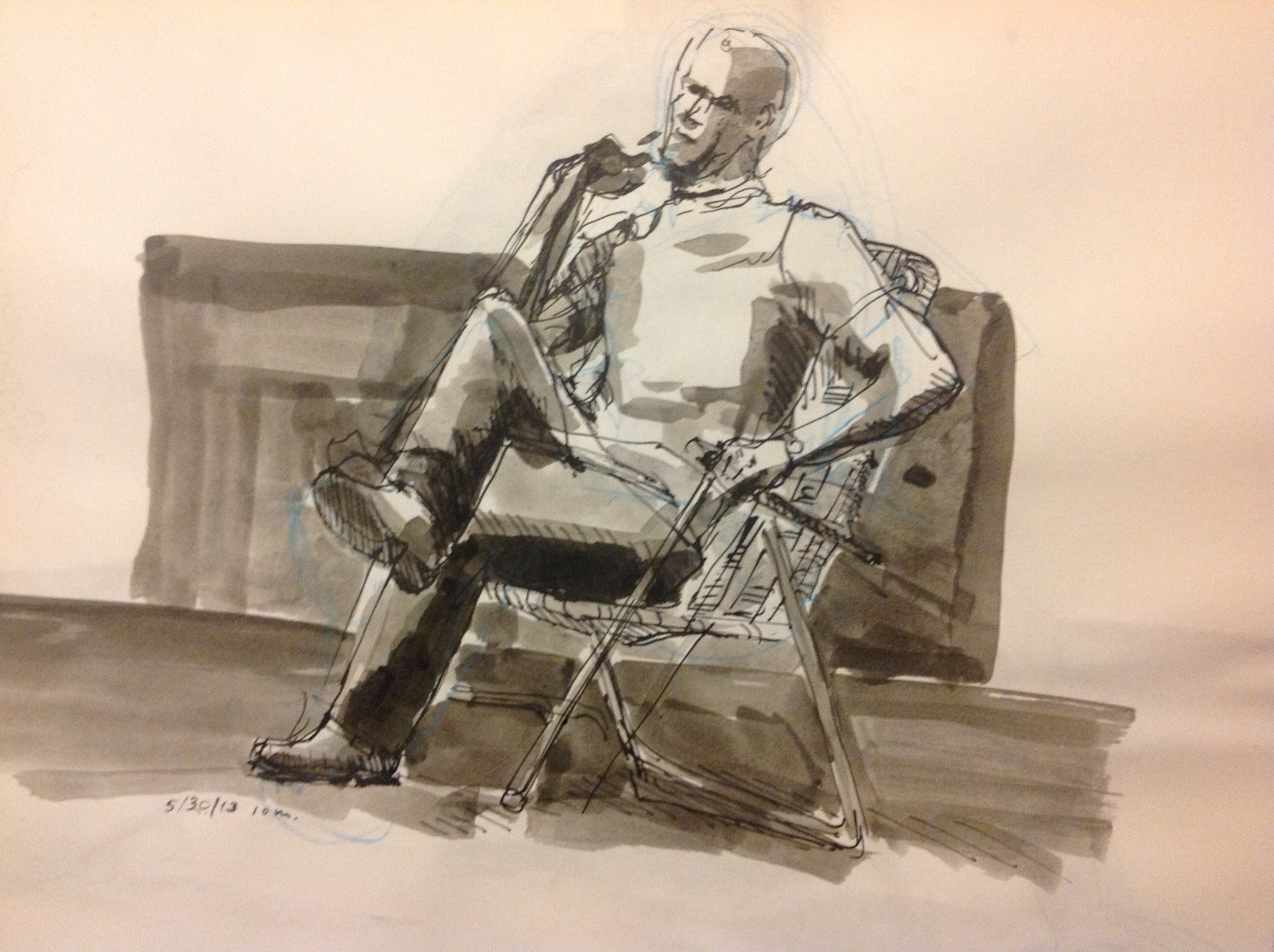 This was a 10 minute drawing, started with a non-photo blue pencil and then gone over with an ink pen and then an ink wash for the values. I like the strong direction of the diagonal line from his bottom foot right up through his legs and right arm to his head, and then other diagonals radiating through his left arm, the arm of the chair, and the back legs of the chair. The size is 11 x 14 inches.