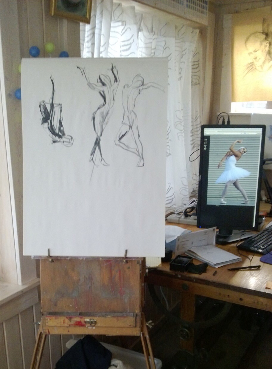 I had to upgrade my computer system to be sure I was compatible with others I work with when I design books and newsletters. A side benefit of upgrading is I can rotate the 24-inch Dell monitor so I can draw from reasonably large photos on the Web. In the photo I have a French easel set up with my newsprint pad and charcoal and on the monitor is a photo from pixelovely, a great site for drawing practice. These are 1 minute sketches. I'm working on drawing values instead of just outlines. Up in the right corner is a drawing of me by Max Ranft, the teacher that really got me on the right track with figure drawing.