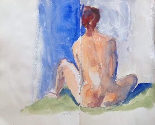 Putting this figure on two pages is almost ironic, since you could pretty much divide it down the middle vertically and say the right side held together pretty well—nice edge where the right side of her back is in front of her right arm; nice substantial right leg and buttock; decent head angle. This against the left side with a jittery line for the thigh and complete indecision on where to place the left foot. Oh well, a common enough difficulty in a half-hour drawing/painting. Working against the clock is a lot of fun!