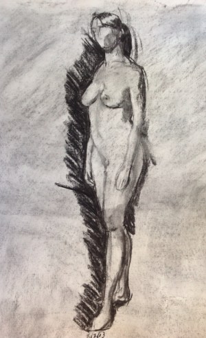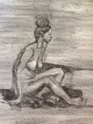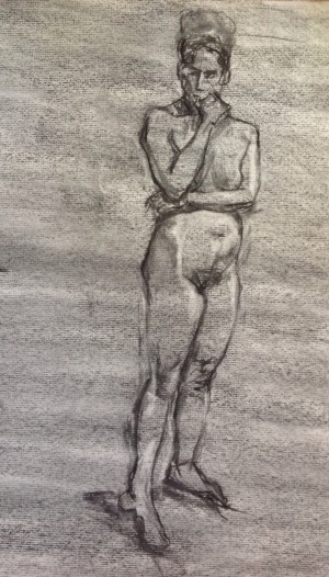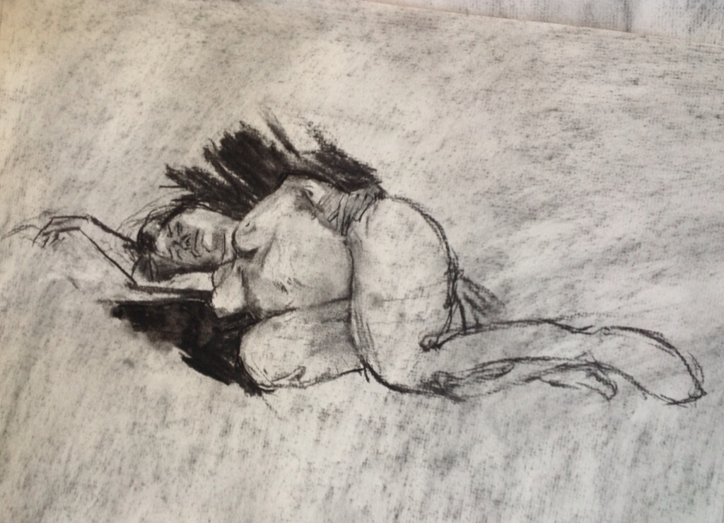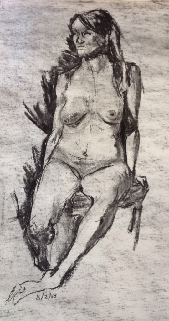 One day's half-hour poses at the Palette and Chisel, trying to do things á la Graves's Life Drawing in Charcoal. 12 x 18 or 18 x 24 inches using vine charcoal and a kneaded eraser for the highlights. I'm working on my edge control. Right now I'm doing too much line drawing and my edges overall aren't soft enough. I need to work on “lost and found” edges.