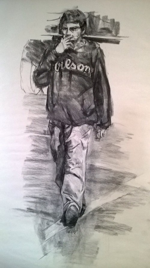 My first charcoal drawing from one of my own photos! I've been doing a lot of copying from Internet photos—a lot of nudes from the site http://artists.pixelovely.com/practice-tools/figure-drawing/ for quick sketch practice, and some figures from Garry Winogrand photos. Copying the Winogrand photos gave me the idea that maybe I could use my own photos. I found it's not that hard to take people on the street photos, and after going through my photo library and clipping out figures I have a large collection to draw from.