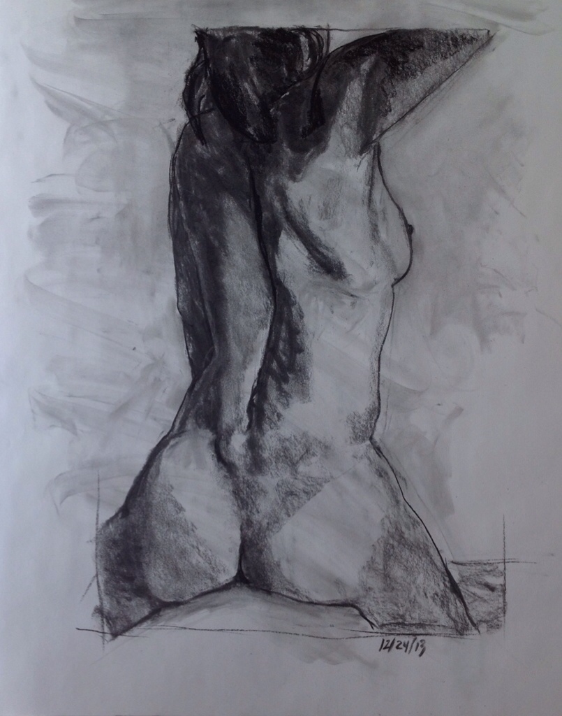 Unfortunately, he also talks about not slavishly copying what you see, but using what you see to create the illusion you want to portray. In this case I copied the dark shadows behind the scapula and across the top of the model's left buttock and even darkened them. Since those shadows were in areas that are overall light areas of the form, I should have kept them a lot lighter so they didn't cut into the light areas so much.