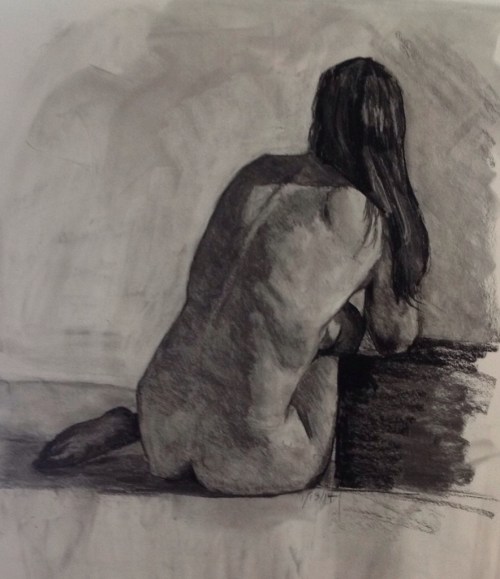 From “The Practice and Science of Drawing” by Harold Speed: “Nothing is more awful than shadows darker in the middle and gradually lighter towards their edges. Of course, where there is a deep hollow in the shadow parts … you will get a darker tone. But this does not contradict the principle that generally shadows are lighter in the middle and darker towards the edges.” I tried to follow this idea, even though I don't fully understand it. I guess it means the core of a shadow is the darkest part, the core being the part just inside the edge of a shadow between the highlight area and reflected light coming from the other side. In the drawing above, that would be just inside of the vertical shadow line running from her spine at the top to the edge of her pelvis at the bottom. This is a one and a half hour drawing on plain white paper using vine charcoal in the beginning and compressed charcoal for the darkest areas, plus a charcoal pencil for details.