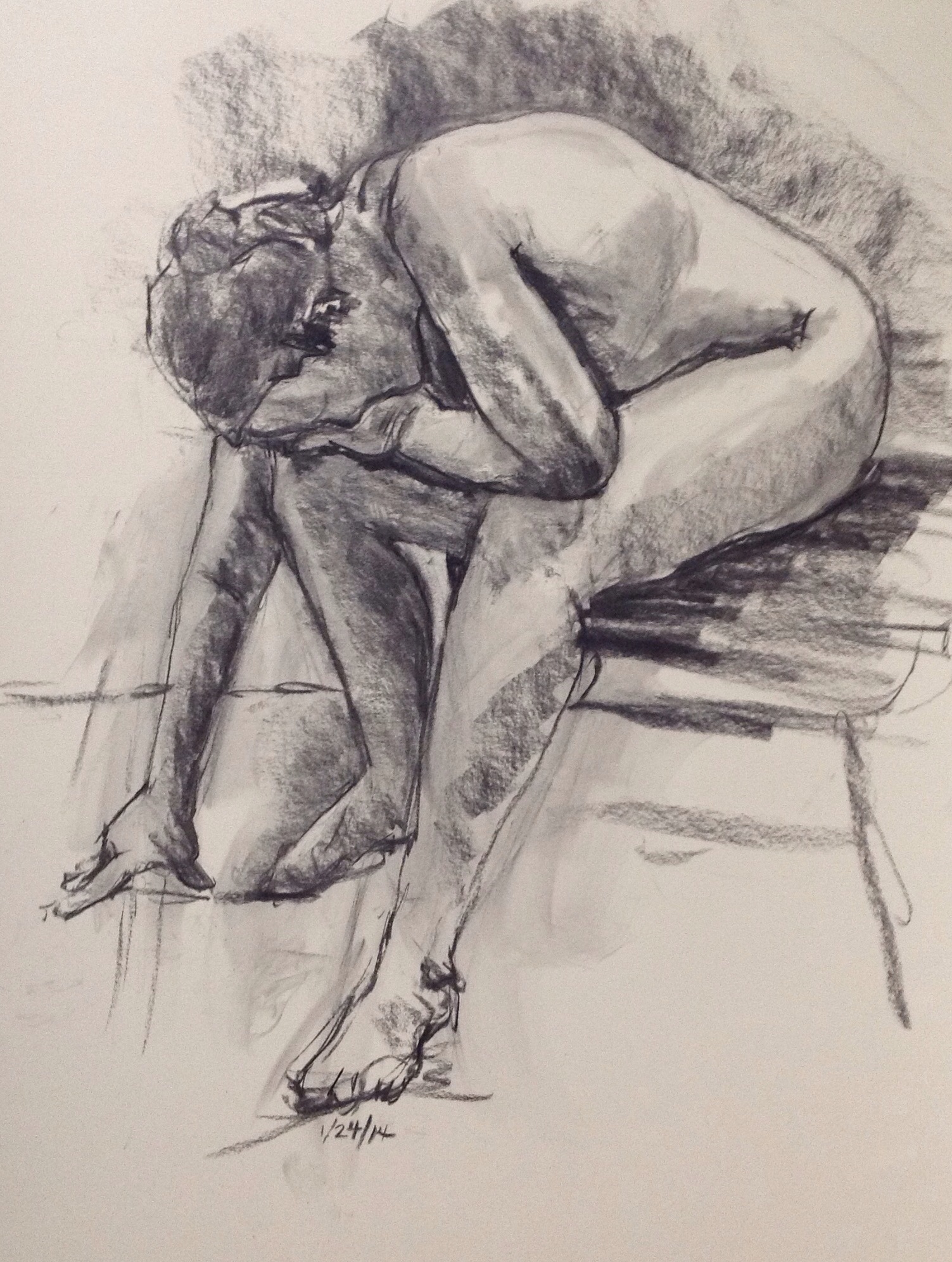 This is a work-in-progress as I usually run out of time. I do feel that I get more done in each of the quick sketch time periods from one to thirty minutes as I get more experienced, i.e., what takes fifteen minutes now used to take much more time. To use a sports metaphor, doing the one-minutes, etc., is helpful in “slowing down the game” when I get to the thirty-minute poses.