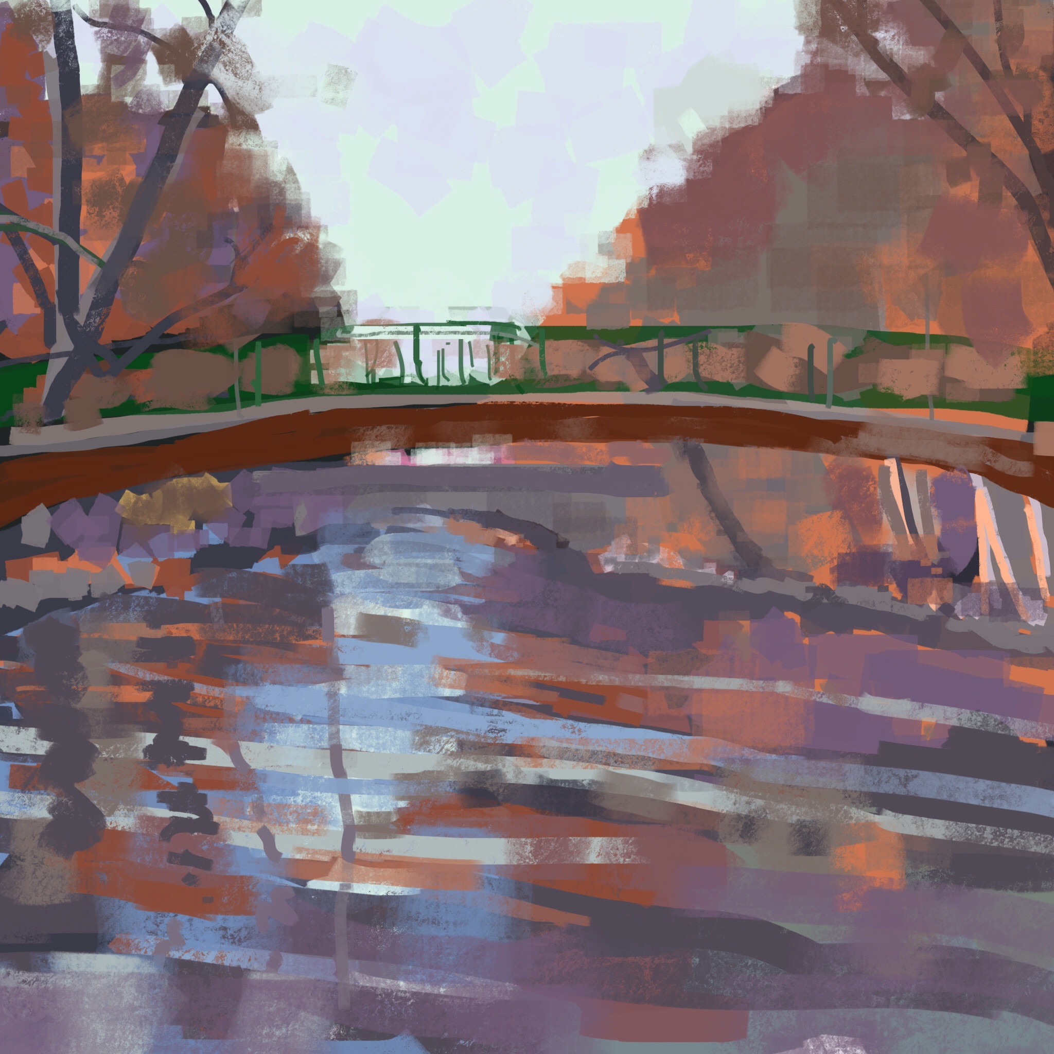 After snow this week, things warmed up enough to spend a couple hours sitting on a rock with my iPad. Since I started at 2 pm, it was a race against time to finish before sunset, which comes way too early these days. You can just see the bridge in this Google Streetview picture taken in the summer: 502-698 Riverside Dr, Madison, WI 53704. https://goo.gl/maps/ZkWbf9dSWZL2