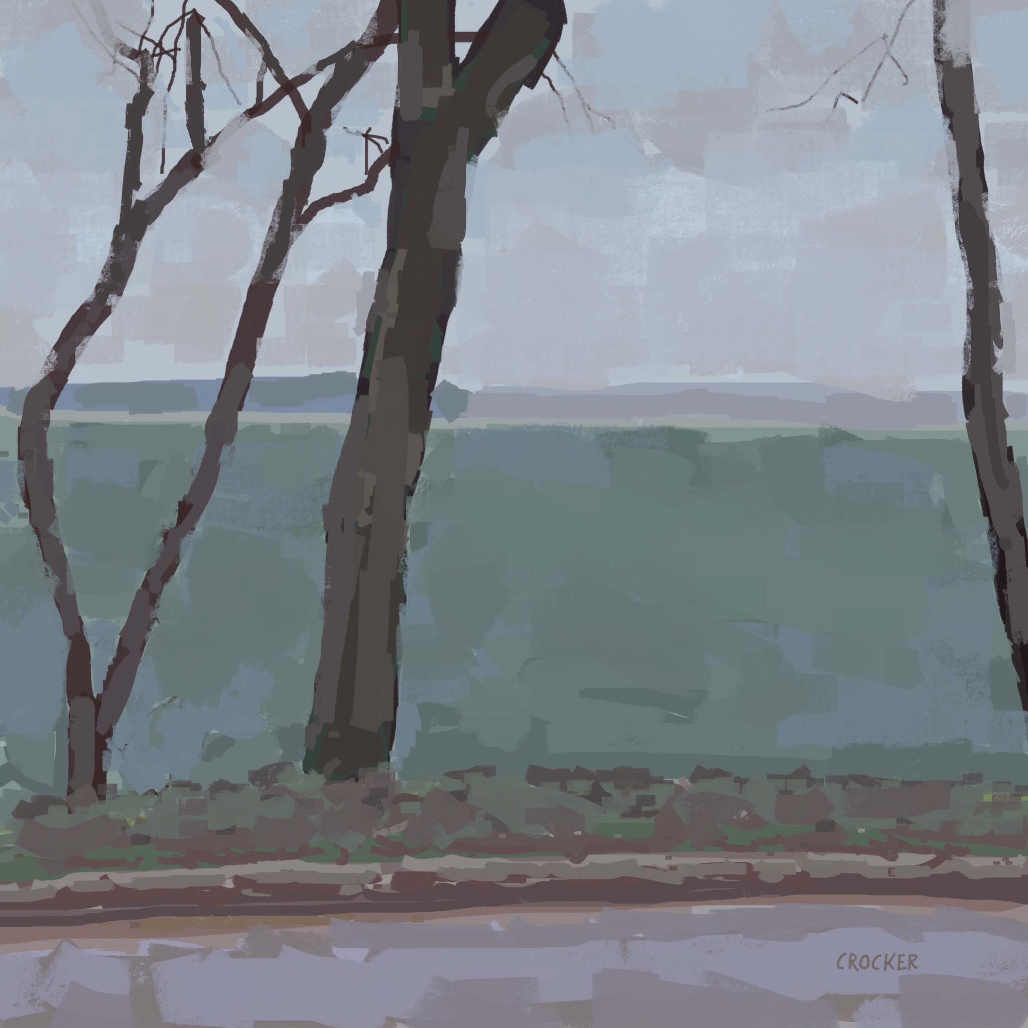 Another day driving off in the morning thinking I'll go somewhere to paint and winding up two blocks from my house, struck by the view of the lake on this particular day. I only had an hour and a half until the day cleared and it was too bright to keep going. Sitting in my car is not my favorite way to work, but today it worked out great. My Bracketron holder lets me hang the iPad from the top of the steering wheel right in front of me.
